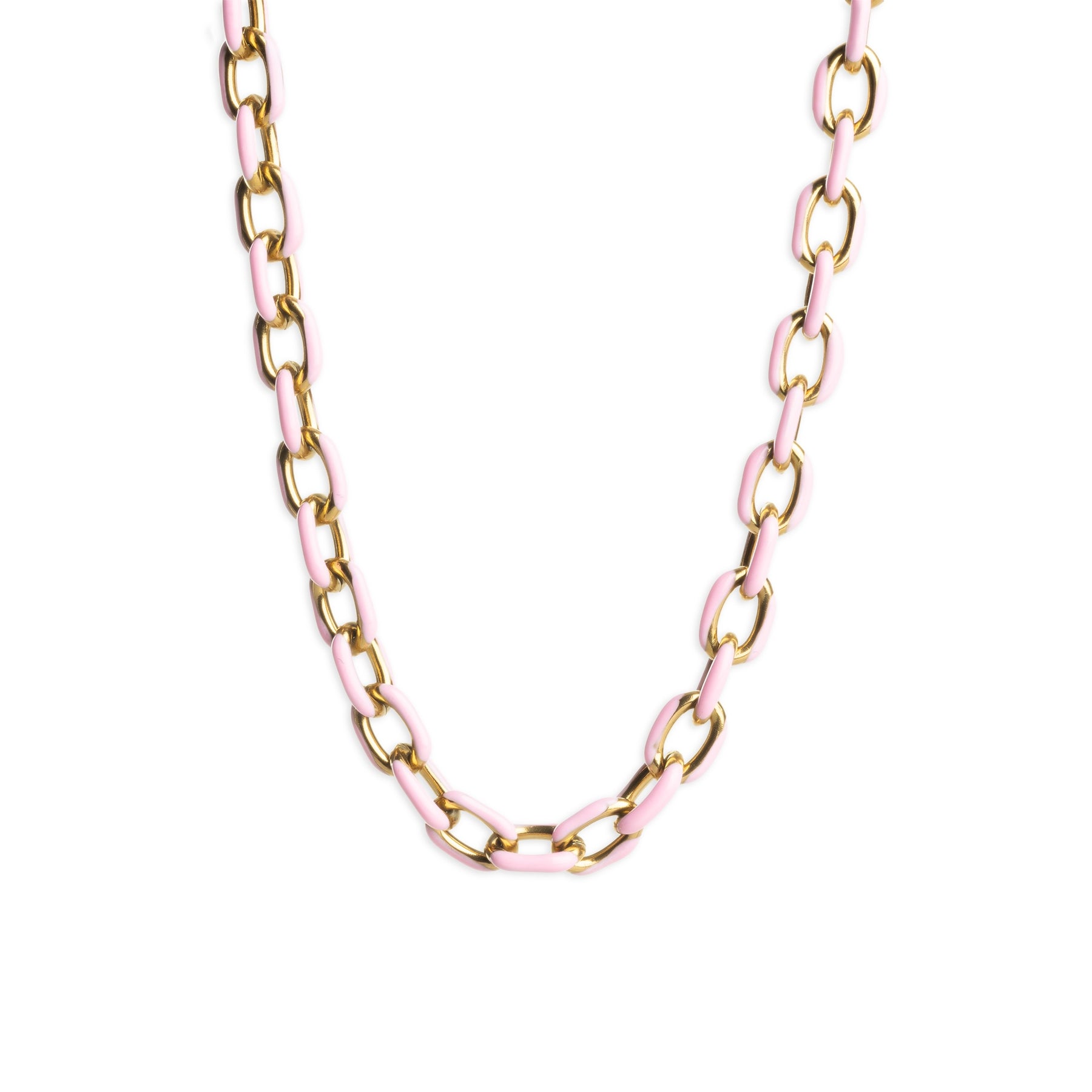 Una collana a catena colorata in acciaio inossidabile waterproof e smalto, per un look d'impatto. Disponibile in bianco e rosa.